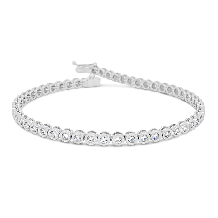 Sleek and stylish, the Bezel Set Tennis Bracelet is a modern take on the classic tennis bracelet. Set in 14k white gold, it features 1.62 carats of shimmering diamonds with a bezel setting that enhances their brilliance. This refined design makes it an excellent choice for both casual and formal occasions.